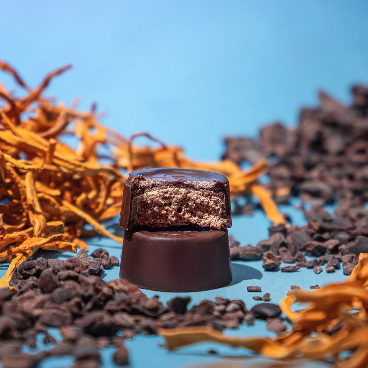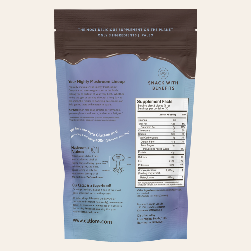 Meet Cordyceps, also known as the "energy mushroom." This powerhouse mushroom is renowned for enhancing vitality, endurance, and stamina by boosting oxygen availability in the blood. We've crafted a delicious combo with 2,000mg of Cordyceps nestled in a chocolate ganache filling wrapped in our signature dark, organic chocolate. This is bound to become your go-to pre and post-workout pick-me-up!*